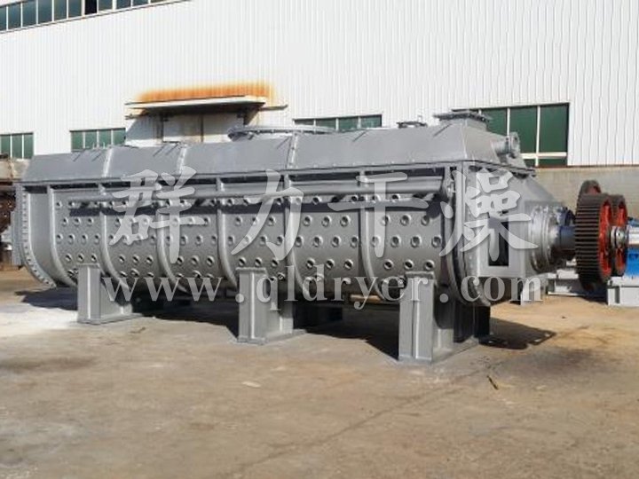 空心轴上密集排列着楔型中空浆叶,热介质经空心轴流经浆叶。单位有效容积内传热面积很大,热介质温度从-40℃到320℃,可以是水蒸汽,也可以是液体型:如热水、导热油等。间接传导加热,没有携带空气带走热量,热量均用来加热物料。热量损失仅为通过器体保温层向环境的散热。楔型浆叶传热面具有自清洁功能。物料颗粒与楔型面的相对运动产生洗刷作用,能够洗刷掉楔型面上附着物料,使运转中一直保持着清洁的传热面。浆叶干燥机的壳体为Ω型,壳体内一般安排二到四根空心搅拌轴。壳体有密封端盖与上盖,防止物料粉尘外泄而充分发挥作用。